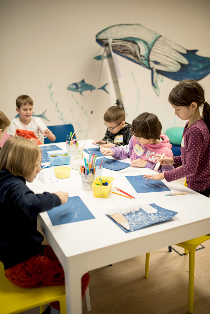 W poniedziałkowy poranek, każdy uczestnik nieśmiało przekroczył próg HKF Centrum. Pierwszy dzień i odnalezienie się w nowej grupie to duże wyzwanie dla najmłodszych. Jednak z pomocą pani Oli i pana Mateusza wszyscy dobrze się poczuli i od razu przeszli do twórczego działania. Pierwszym kreatywnym zadaniem było stworzenie kontraktu zajęć, czyli zasad tak, aby każdy był bezpieczny i dobrze się bawił. Padło pytanie „Ulepimy dziś bałwana?” i tak się stało za pomocą kredek, nożyczek i waty. Bałwanki nie tylko dekorowały salę, ale były „podpisem” pod naszymi zasadami. A to po to, abyśmy mogli odkryć moc dobrej zabawy w czasie zajęć: Integracji sensorycznej, treningów kreatywności, warsztatach o emocjach czy aktywnościach w Sali Doświadczania Świata Snoezelen.