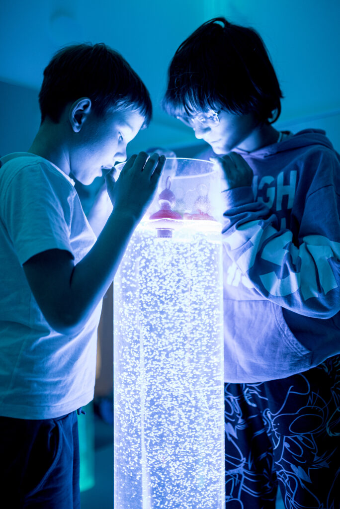 Najbardziej oczekiwanym punktem dnia były zajęcia w Sali Doświadczania Świata Snoezelen. To wyjątkowe przyciemnione pomieszczenie zachwyciło dzieci. Świetlne tuby, kolorowe kształty i basen z kulkami zachęcał do swobodnej aktywności oraz odkrywania świata na innym poziomie. A co najbardziej podobało się uczestnikom półkolonii? Wodne łóżko było miejscem najbardziej popularnym. To tam dzieci mogły się wyciszyć od nadmiaru bodźców. Delikatne wibracje działały kojąco i każdy deklarował chęć posiadania takiego sprzętu w swoim domu.